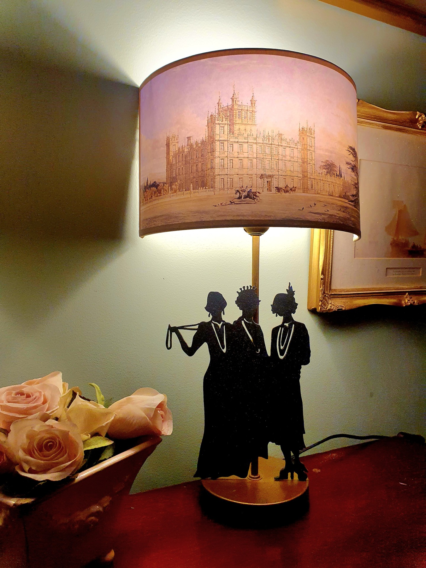 pied de lampe doré ou noir ( choix à indiquer en commentaire en passant commande)Silhouettes en bois aimantées. Abat-jour demi-lune impression numérique.