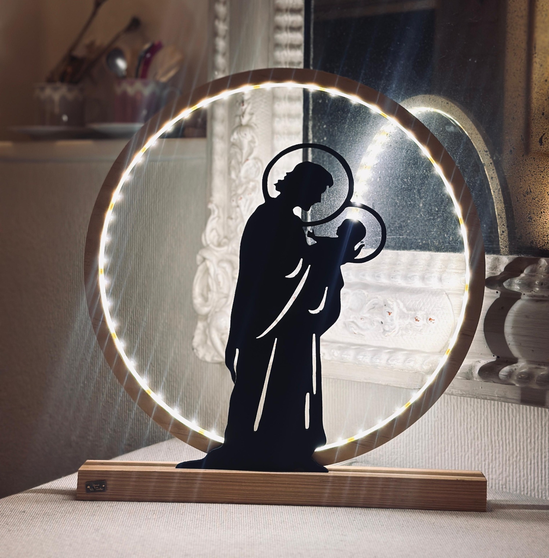 lampe en bois équipée d'un ruban led avec un interrupteur et à brancher sur secteur.