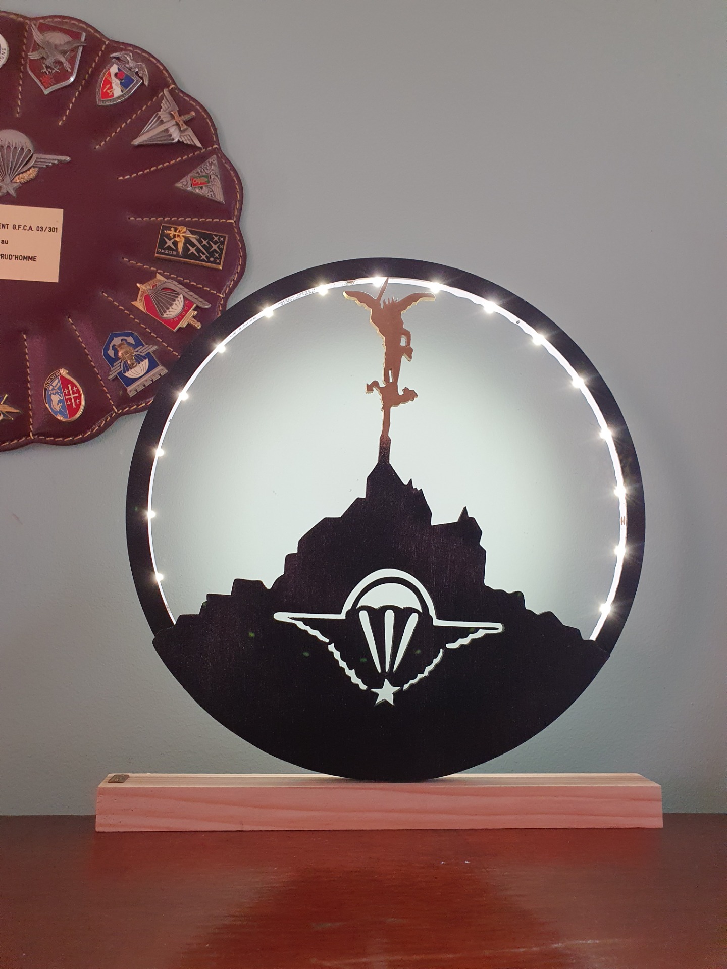 lampe cerceau avec ruban led à brancher sur secteur.option piles possible. 30 cm de diamètre. Silhouettes et base en bois.